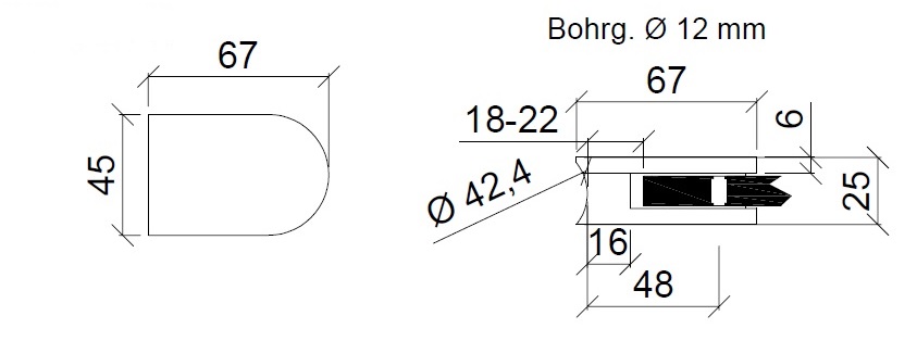 Material/Oberfläche: V4A Edelstahl matt - Klemmhalter, Rundrohrmontage Ø 42,4 mm - mit Sicherungsstift - für 8 mm bis 12,76 mm Glas möglich