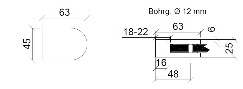 Material/Oberfläche: V4A Edelstahl matt - Klemmhalter, Flachmontage - mit Sicherungsstift - für 8 mm bis 12,76 mm Glas