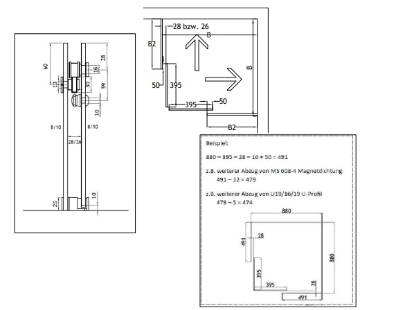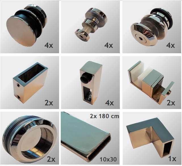 Oberfläche: Chrom glänzend - Eckdusche mit 2 Türen + 2 Fixteilen - Laufschiene: 2 Stk. L = 1800 mm - inkl. 2 Paar Griffmuschel SD K07 - für 8 bzw. 10 mm Glas Skizze_S-180 - Set C_Typ 2